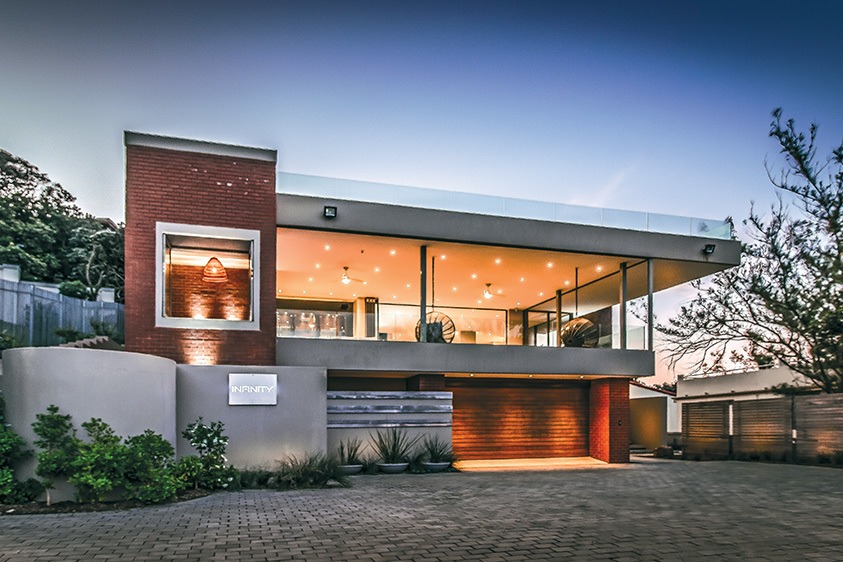 Plus factors on the site were a rolling lawn with wild banana plants, milkwoods and other indigenous shrubs and bushes at the rear. The architect’s brief was to maximise the view opportunities towards the ocean and the main swimming beach. They say: ‘The house name is Infinity, thus intimating the desired