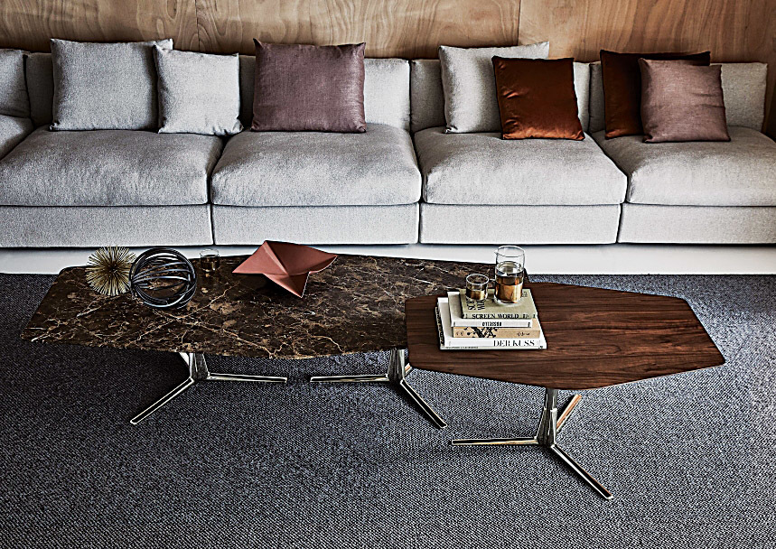 Distinguished by the same elegant metal base as the namesake armchair, the Sveva coffee / side tables designed by Carlo Colombo express their bold personality through the unusual shape of their tops. In addition to the more familiar round shape, the top of the Sveva tables is available in a unique hexagonal shape in various sizes, allowing for the creation of a visually pleasing though unexpected interplay of overlapping shapes. The pairing of luxurious materials only adds to their allure: the metal bases – available in satin, chrome, burnished, black chrome and champagne finish – can be matched with tops in sophisticated wood, lacquer or marble.