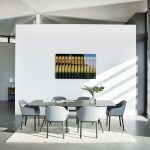 On arrival at the front door, the visitor is greeted with a rich view of this seemingly ancient-looking stone wall that contrasts with the bold modern form and a dramatic, double-height space that is bridged with a private journey to the master bedroom suite.