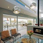 Architect Chinelli adds: ‘The low-lying proportion of the folded concrete form sets the scale for the rest of the house to follow. The bedrooms float effortlessly above the covered entertainment area allowing the kitchen, dining and lounge – running parallel to the terrace – to enjoy a single-storey, mono pitched roof. Sitting and dining rooms are subtly separated via the use of a double-sided slow combustion fireplace that supplies heat to both sides. A long axial circulation space runs through the length of the building, allowing views right through the house at both ends.