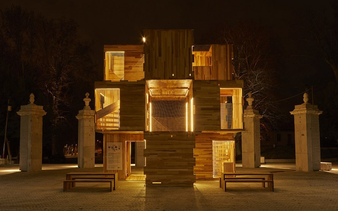 MultiPly, an eight-meter-high, carbon-neutral, timber pavilion, made exclusively from American tulipwood, has opened to the public in Madrid Rio at its entrance to the Casa de Campo, as part of the Madrid Design Festival. The installation was unveiled on the 1st of February and will remain open for two weeks. A collaboration between Waugh Thistleton Architects, the American Hardwood Export Council (AHEC) and ARUP, MultiPly responds to two of the greatest challenges of our time: the growing need for housing and the urgency to fight climate change, presenting as a solution the combination of modular systems and sustainable building materials.