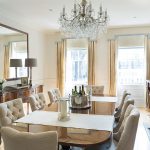 Inspired by Linley’s fusion of comfort and elegance, the interior was designed with the main focus being on how the rooms would feel at every point of the day. Light sources were sympathetically considered, with a trio of French windows channelling beams of light into the living room and Art Deco wall lamps glowing subtly after dark. The townhouse now has five double bedrooms, all with en suite bathrooms that feature slabs of bespoke marble, a triple-window wide living room in which the size is emphasised by a full wall mirror, and a kitchen / living space created specifically for the requirements of family life.