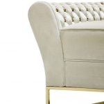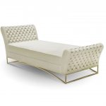 Lust is an opulent chaise-longue that stands out for its hand-whicker. The upholstered white velvet over a polished gold brass base is the epitome of luxury.