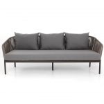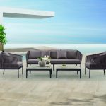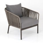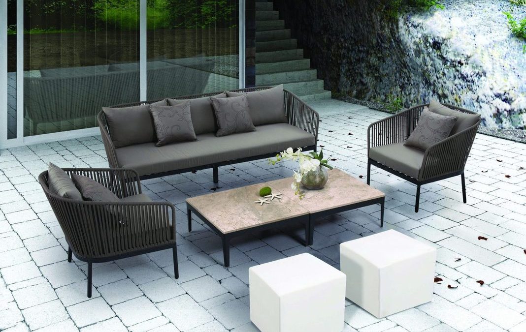 The collection consists of a three-seater sofa, comfortable deep seated armchairs, and a marble-top coffee table. The lounge suite features eye catching flat rope weaving around the frame with a comfortable seat and back scatter cushions that come in anthracite colours.