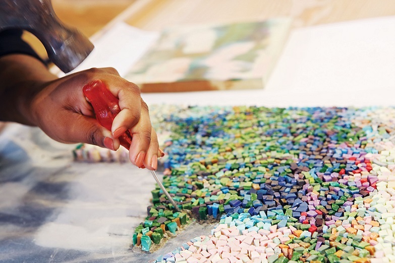 Eight, Spier’s acclaimed farm-to-table restaurant, has a new neighbour. The next time you come for lunch, arrive a little earlier and pop into the new Spier Artisan Studio – Stellenbosch next door. In this airy, light-filled space, rows of jars containing brightly coloured glass line the walls. In the glow of the chandelier overhead, artisans are quietly at work. They’re using hand-cut mosaic or beads to create, with meticulous precision, interpretations of works by South African fine artists.