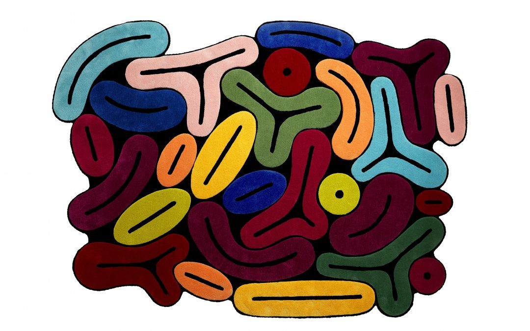 The fourth design is tufted and embodies certain codes of the artist’s artworks: organic, colourful and captivating shapes create an original form, their relief is brought to life by varying thicknesses contrasting against the black background.