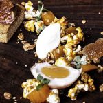 The final course’s ‘death of strawberry shortcake’ comprises a strawberry bombe, strawberry coulis, white chocolate sponge, vanilla ice cream strawberry gel, strawberry pastille, soft strawberry fizzer and assorted summer berries. Alternatively, the coconut sphere with a coconut moelleux, coconut panna cotta, butternut churros, burnt orange sauce and coconut marshmallows won’t disappoint. The ‘chicken and the egg’ is a gluten free vegan cake, vegan egg, caramel popcorn, almond praline, chicken pectin jelly, soy caramel, almond milk sorbet and fresh apricot.