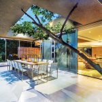 Says the architects: ‘We approached the surrounding natural forest with great caution prior to the construction phase. Our plan from the outset was to use large glass openings, slot windows and slab cantilevers, which project out right into the forest. Many elements of the home were specifically designed to accommodate specific large trees that became focal points, which integrated and pushed through slab elements – even touching parts of the exterior.