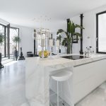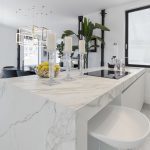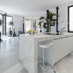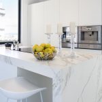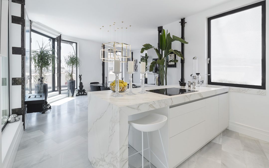 The waterfall island cladded in Neolith® Calacatta stands out in the swimmer’s impeccable open kitchen which connects to the living room and spectacular terrace for a 360º view of Madrid.