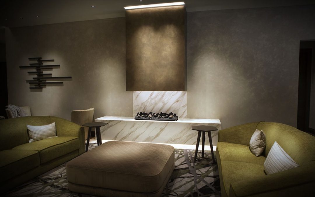 Another benefit of Neolith Calacatta Gold is its outstanding property in terms of compaction and durability. Resistant to scratches, impacts, abrasion, frost, high temperatures, and UV-exposure, it is suitable for areas with high footfall, such as hotels. Specified to clad the reception pods in the hotel lobby and the fireplace hearth area, the Neolith Calacatta Gold décor was bookmatched, and the edges mitred at a 45° angle for a seamless effect. The end result was a sophisticated and luxurious design which complemented the metallic brass and bronze finishes that THDP used in the colour palette of the lobby.
