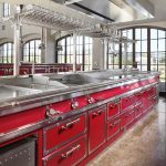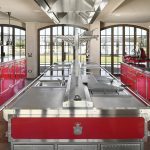 The second island, characterised by two lateral ‘wings’ that conceal two-wheeled food trolleys, allows for professional cooking with a clear-cut distinction between the area for first and second courses. In fact, it’s equipped with an induction top, pasta cooker, sink for preparation and two ovens – on one side – plus a fry-top, fryer and sink on the other. The satin finished nickel hood is of significant size and provides an extremely professional extraction performance.