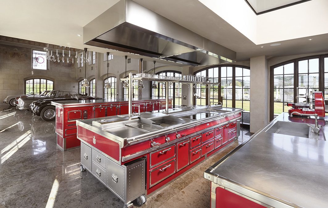 This kitchen, in fact, evokes the colours and finish of one of the vintage cars on the property.