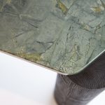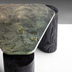 Adam Court, responsible for all furniture design by artisanal luxury brand OKHA, immediately fell in love with the “Verde Magnifico” marble when he saw it; the marbles visible layers of history speak to OKHA’s South African locality of cosmopolitan, polyglot and multi-cultural charm. Court conceived of Magnifico side and Magnifico coffee table together. A pair of hand-crafted tables, whose varying sizes and weights represent OKHA’s small artisanal position as well as its global expression; their irregular shape of perfect triangle and perfect square cut off at the edges are testament to the vast natural geologic surroundings of Cape Town and South Africa which inform OKHA’s design process and choice of materials.