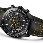 Elsewhere in this new creation, OMEGA has embraced its popular “Dark Side of the Moon” innovation, producing the entire watch in black zirconium oxide ceramic. To contrast this dark tone, the brand has chosen chronograph hands that are varnished yellow, while the watch’s tachymeter scale and crown are filled with Super-LumiNova. The black and yellow theme extends to the perforated leather strap, which contains a section of yellow rubber through the middle.