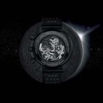 The unique design is instantly clear when you view the dial, which has been expertly skeletonized to reveal the blackened movement inside. The movement itself has also been laser-ablated to precisely decorate the bridges and main plate with realistic imagery of the lunar surface.