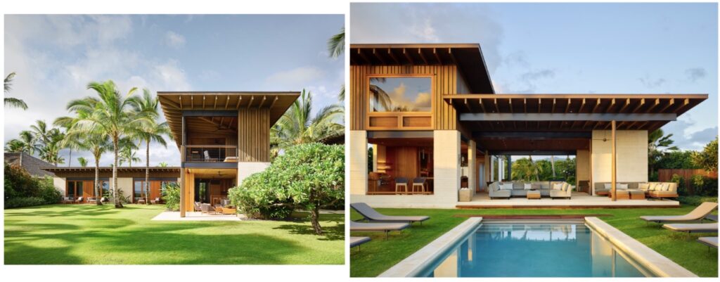 Beyond the main house and guest house, the site features a large yard and pool, as well as beach access. The main house and adjacent guest house – both L-shaped structures – feature pigmented, board-formed concrete base structures, with dark timber cladding the upper portions. Low-pitched roofs reach out to provide deep overhangs offering semi-protected transition spaces between inside to outside.