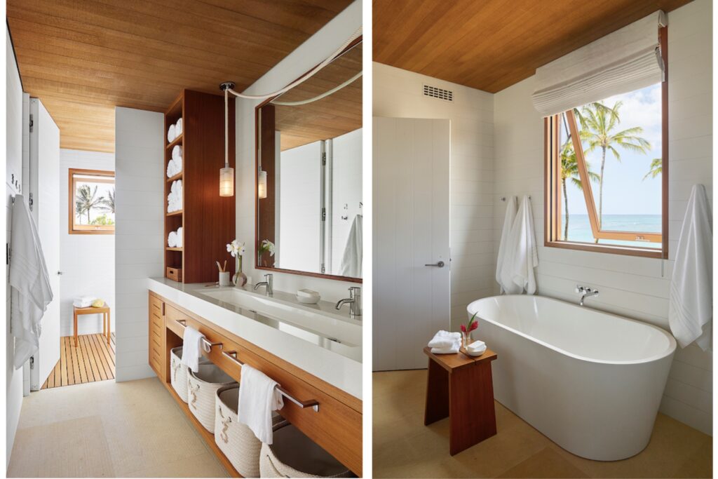 Says Stacy Stone from Stone Interiors: We were lucky enough to meet a local wood worker who told us about a large monkey pod tree that needed to come down. It was just up the road from the site and it was used to make the lanai bar top.’