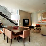 - A pendant lamp hovers as a centrepiece above the dark-stained custom designed oak table; low-back upholstered dining chairs add subtle colour and texture.