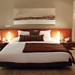 - The generous proportions of the low-slung upholstered headboard encompass the entire width of the bed and the bedside pedestals.
