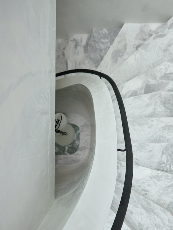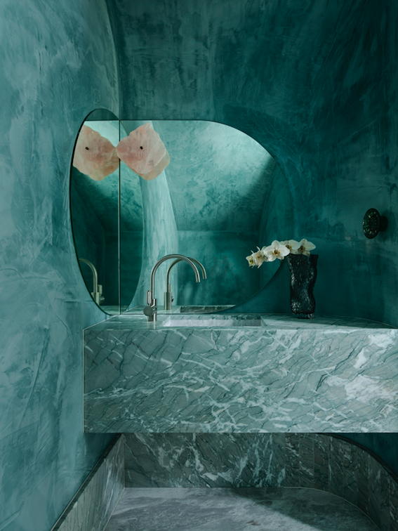 And she continues to admit: ‘Another challenge we had, which turned out to be – as it often does – our greatest achievement, was the little powder room. We really didn’t want it to feel like it had been stuck underneath the staircase, but inevitably that’s where we had to put it. So, we ended up relieving all of those staircase lines. You can see the staircase goes up the back because it’s got a piece of plywood curved over the entire roof. In both the staircase ending and connecting lines, concrete was hidden and therefore it’s like you’re encapsulated in a big dark green Venetian plaster cave. No ceiling wall lines are visible. It feels like a cave of treasures with all that marble and rose quartz and all that lovely, moody dark colour and curves. Says Shona: ‘Yes, we leaned straight into the fact that it was going to be an encapsulating space. That’s why we did the dark, tactile plaster.’