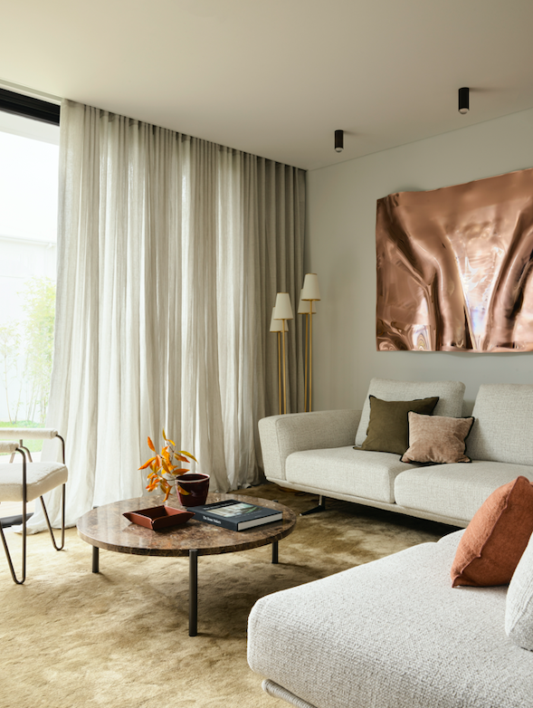 The pendant in the entrance is an art form, and the pink metallic artwork in the living room by Anya Pesce is a two-metre-long sculptural piece that produces the same reflective qualities as the house’s.