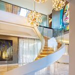 - Agate Stone-finished Branquinho lights hang over the spiral staircase.