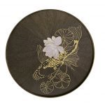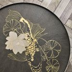 Shapes of Eastern inspiration decorate the grey oak surface of the second table on which an elegant carp with a mother-of-pearl eye is positioned alongside a graceful water lily in larch wood and delicate aquatic leaves with brass profiles.