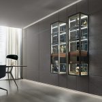 The range of materials and finishes has also been enriched. In addition to glass and aluminium, the- distinctive elements of the Rimadesio brand, are porcelain gres, Crystal Brown marble, Sahara walnut wood – with a wavy effect – and an exclusive synthetic leather in four finishes (castoro, argilla, nube and rubens), made in Italy and animal component-free.