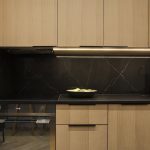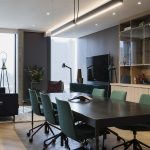 With the prerequisite to deliver sophisticated comfort – in a kind of pied-a-terre – she combined quarter sawn knot-free oak with warm, textured wallpaper, steel elements and black marble to create a sophisticated yet comfortable ambiance. The floor was laid with engineered oak planks and cabinetry has deep concealed shelving with oversized sliding panels that allow for the storage of IT equipment. A fully fitted kitchen with 4-plate stove, oven, integrated fridge freezer and dishwasher (All Smeg Appliances) allow Rockwealth Capital to enjoy daily lunches and facilitate client dining for any function. Workspaces in super matt black laminate by Cecil Nurse slot perfectly into the overall design.
