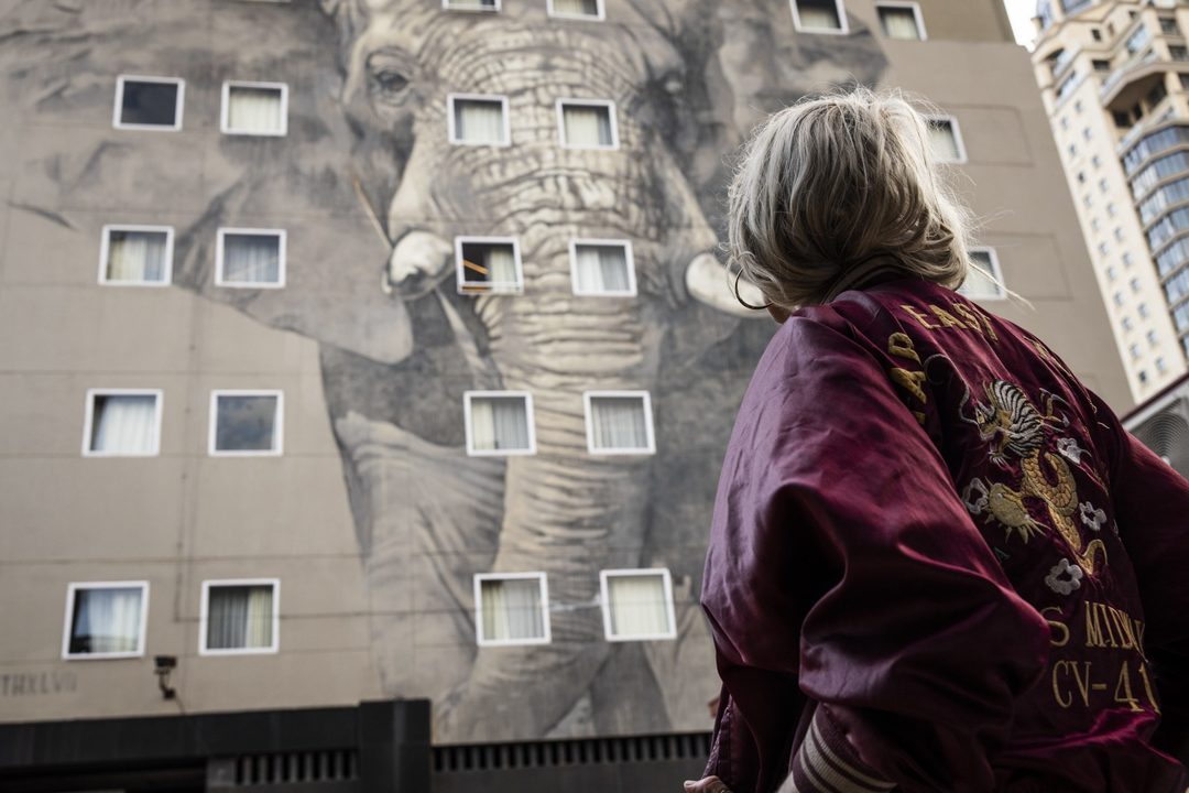In 2017, Faith XLVII relocated from Cape Town to Los Angeles, where she continued to expand and redefine her practice. Today, she is a leading player in the international art scene, yet she sees herself as ‘a citizen of the earth’, part of a wider community of ‘woke’ artists. Through her site-specific works in urban spaces, she seeks to connect with local communities: her monumental black-and-white murals depict animals and mystical creatures as well as symbols of human commonality like maps, hands, and interlaced figures.