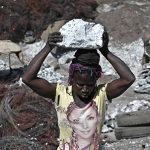 In his series La carriere de granit Mohamed Ouedraogo visits a place that sits uneasily with our conception of the modern world: a stone quarry in the west of Ouagadougou, where men, women and children do heavy and dangerous labour to earn CFA 1 000 (approximately R 22.50) a day. ‘Here work and time do not have the same value as elsewhere,’ Ouedraogo states. The workers are in permanent danger of injury and breathe in an air filled with the smoke of burning tyres and the dust from broken granite. Some of them wear clothes that bear the logos and trademarks of a contemporary capitalist economy. The contrast is a cruel irony but perfectly symbolises the vast schism between the haves and the have-nots in a globalised society.
