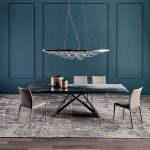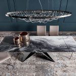 Designed by Paolo Cattelan, Dragon is a table with a unique design, ideal for inclusion in an elegant and refined dining room. While it projects an extremely simple aesthetic, its appearance is, however, enhanced by the crystal top decorated with a special artistic print.