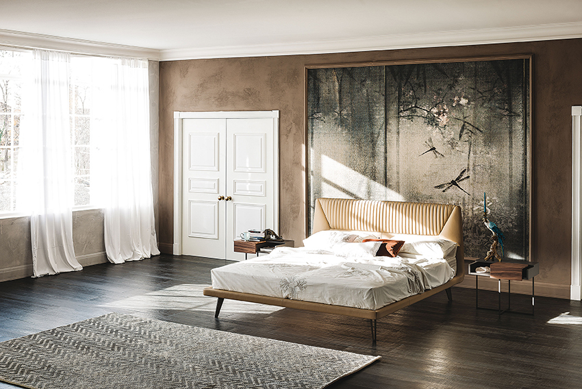 The Adam upholstered bed can be clad in fabric, synthetic nubuck, micro nubuck, synthetic leather or soft leather as per specification. Headboard profiles in matching tones include red (rosso corsa) or orange (lobster), both in soft leather. Canaletto walnut or burned oak feet and slats are included.