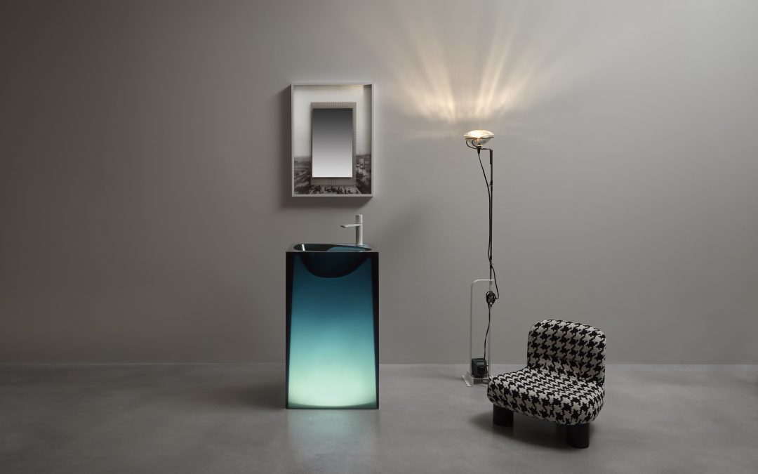Astro and Aura sinks are equipped with LED lighting, are available in 13 Cristalmood colours, the drain is on the floor and the transparent opaque body contains the drain and siphon, hiding them from the outside view. Astro can be combined with a freestanding tap, it also allows you to install a countertop tap on the surface, an important added value for diversified installation needs.