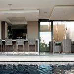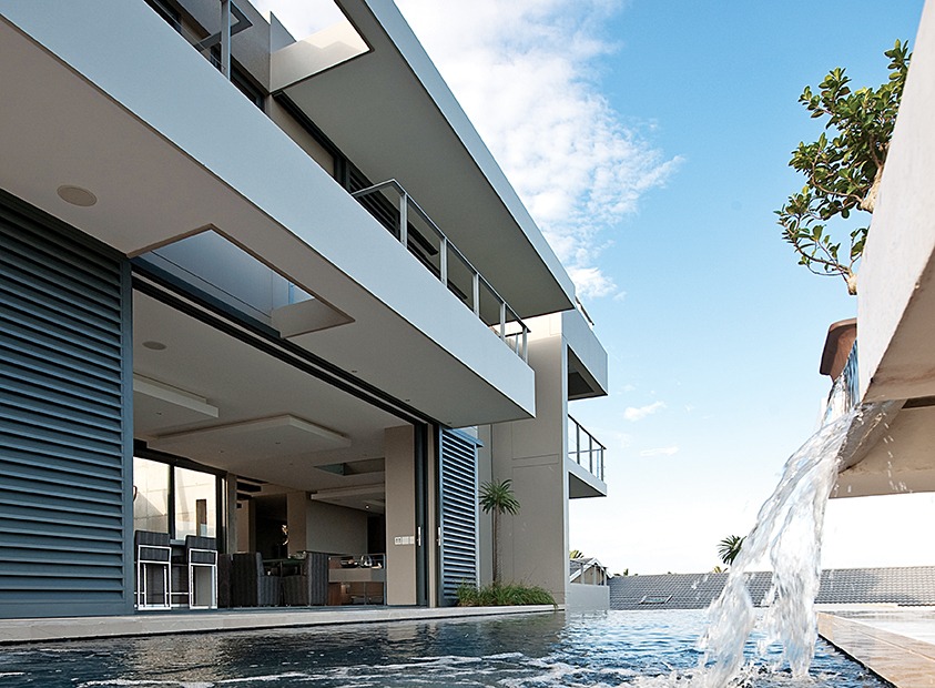 Low-maintenance – particularly necessary due to the dramatically corrosive atmosphere – was a prerequisite. Kitchen, dining and living was interconnected in an open-plan format, yet as clearly defined spaces with their own character, and a separate screened-off TV room was included. The pool area, with spill-over surface to the sea view, has an alfresco cooking facility closely linked to the kitchen. This seamless flow from interior to exterior echoes the relaxed south-coast lifestyle.