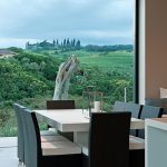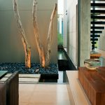 The liberal use of heavily textured textiles, off-set against luminous and metallic fabrics, infuses the neutral colour palette with interest and depth. Reflective surfaces like glass and polished stainless steel diffuse the solidity of the furniture and reinforce a feeling of lightness.