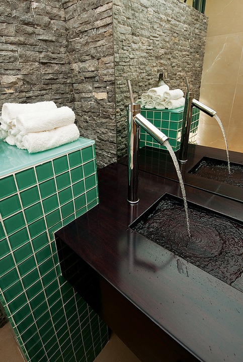 Natural materials are continued in the main bathroom where vivid mosaics are used as a contrast.