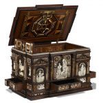 The Renaissance Casket from Newbattle Abbey at Georg Laue, Kunstkammer Ltd. & Trinity Fine Art: made by the Master of Perspective in Nuremberg, and dated 1565, this is one of the first works in Northern Europe to use perspective and geometric polyhedral in its decoration. On public view for the first time since 1883 it testifies to the interaction between art and science. Priced around £700,000.