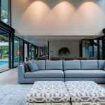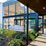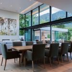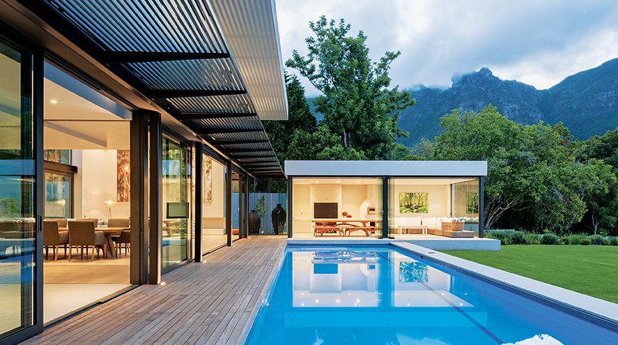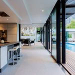 - Tall glass panels obviate the use of steel beams, and glass doors retract to open up the living area – and flow to the outside entertainment area.