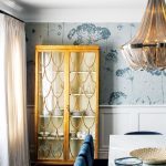 The house is arranged so that it opens up immediately on entry into the formal living room to the right and the formal dining room to the left, both being clearly visible from the other. These spaces were given a similar, linking palette of colour and materials, including strong blue tones, textured finishes and layering, as well as furniture with a distinctly luxurious feel. Subtle added glamour is seen in dynamic, large-scale floral wallcoverings, metallic finishes in gold and brass and definitive chandelier lighting. Both these formal reception rooms have highly polished timber flooring with new overlaid rugs, and the dining room features timber half-panelling on the walls.