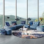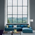 ‘Flexform’s Mood fabric collection plays with soft shades of grey and beige, mingled with deep tones of blue,’ says Raffaela Marelli. ‘The suggestion for the large surface of a sectional sofa is to go with the timeless yet chic choice of a plain but sophisticated colour and add cushions in contrasting tones in order to introduce a decorative accent. We love deep blue to be juxtaposed with white and lime yellow fabrics and also suggest a play of different textures. If the sofa is covered in canvas, the cushions might well be in velvet or cashmere.’