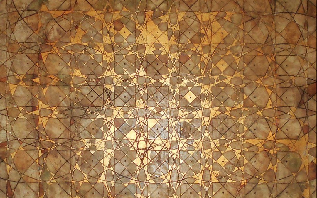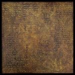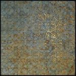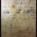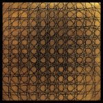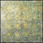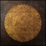 She gathers inspiration from History, Geology, Astronomy, Physics, Botany, Literature, Music, Philosophy, Art and daily life experiences, and adds: ‘I continuously search for a greater understanding of who I am. My interest in space and time is an extension of this meandering journey.’ Astrophysicists speculate as to what lies beyond the edge of the observable universe, the great unknown and these endless possibilities inspire the artist and motivate her reason for being. There are several recurrent threads interwoven into the body of her paintings: the use of material substances – gypsum, oil paint and synthetic gold and silver leaf – plus the thematic use of geometry and writing.