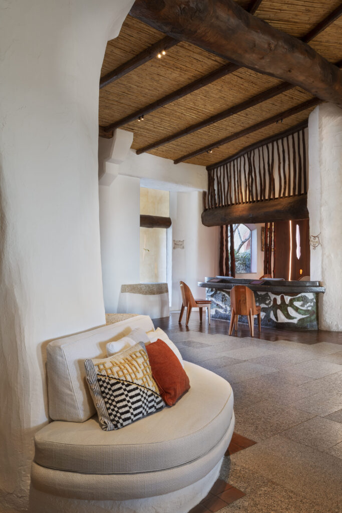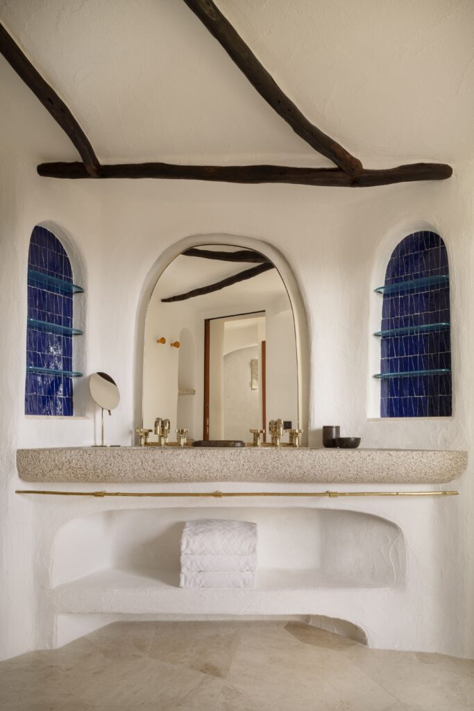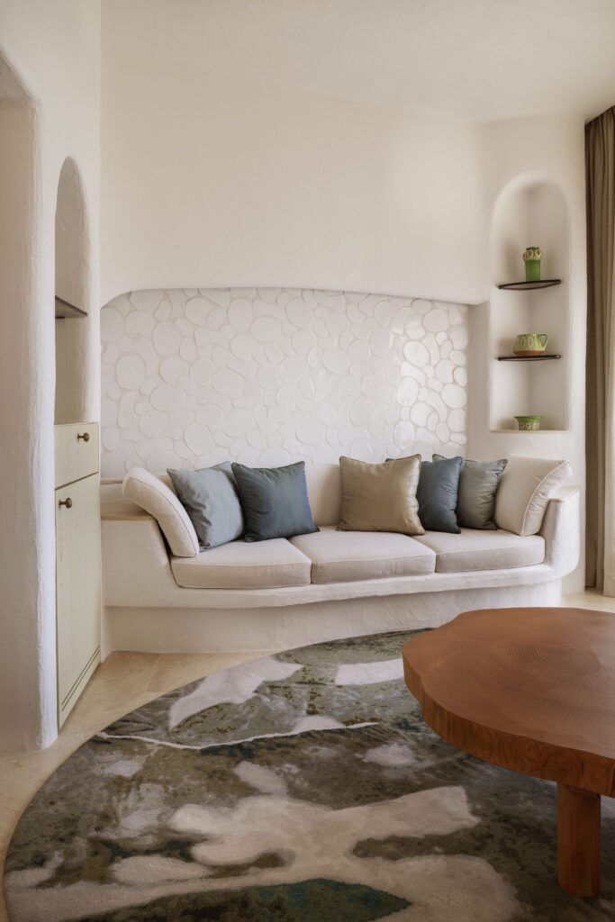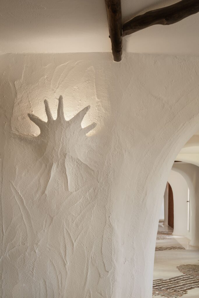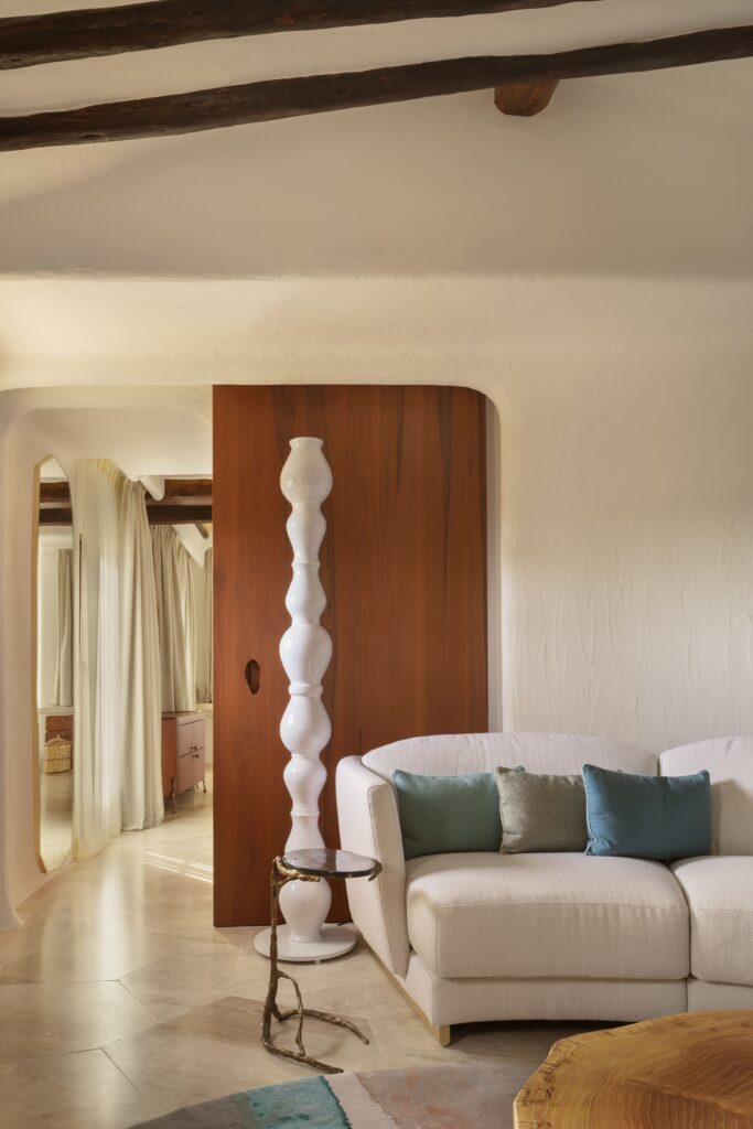 b.m. This was perhaps our biggest challenge. Namely, organising the encounter between roughness, even softened, and extreme refinement, in a contemporary vision. In the setting that is Cala di Volpe, the arcades, buttresses, hidden stairs, unexpected benches, and irregular layout of the floors, everything adds structure and makes sense. We wanted furniture that remained free, without artifice, that would be comfortable, warm, and which dialogued with the walls, and combined with the spaces and uneven openings in a timeless and singular synthesis.