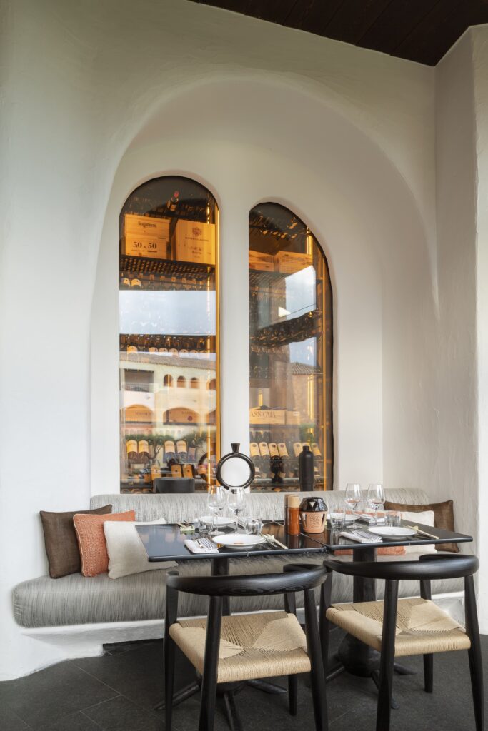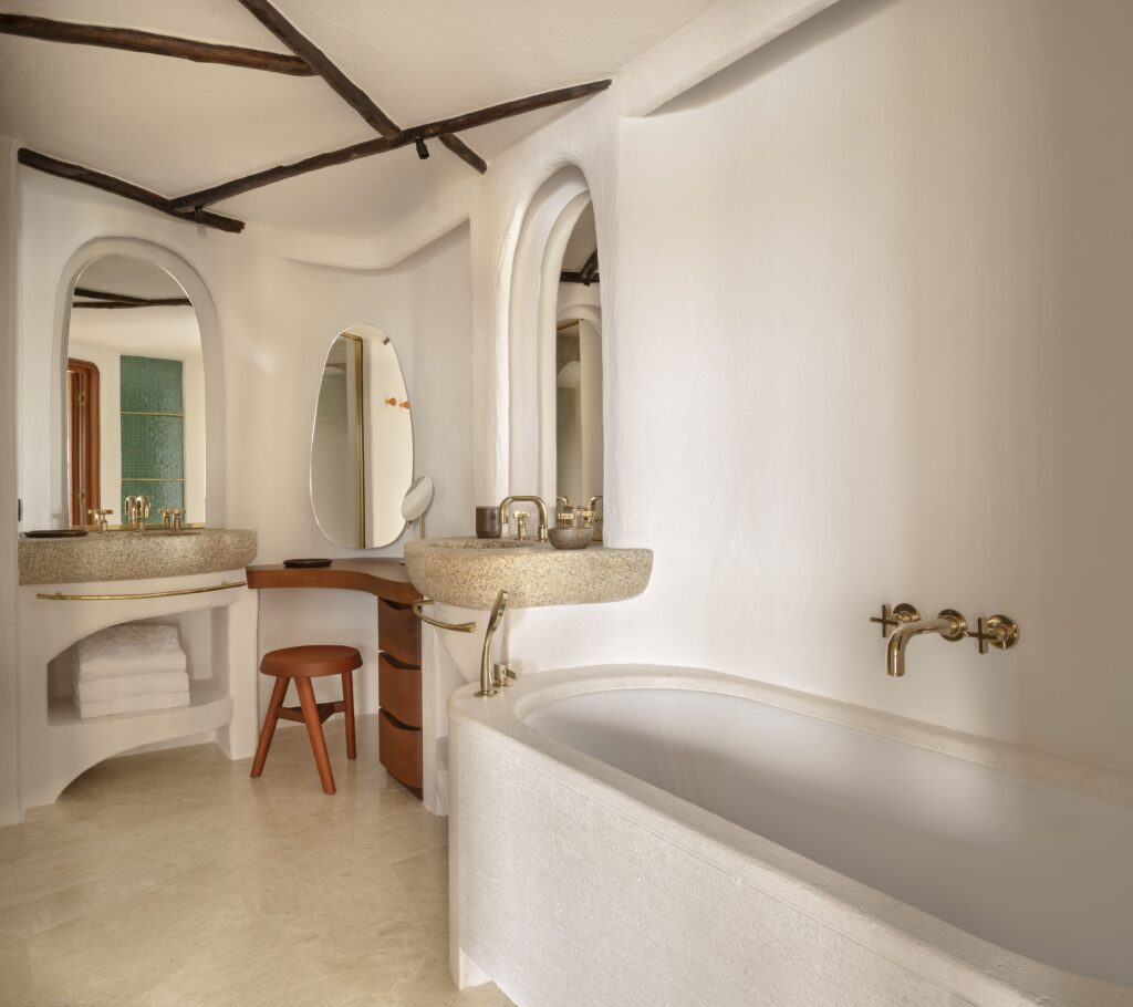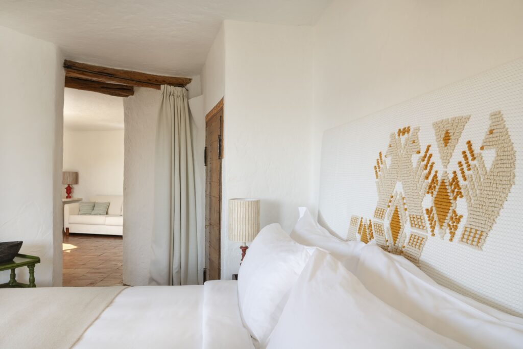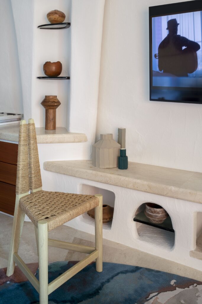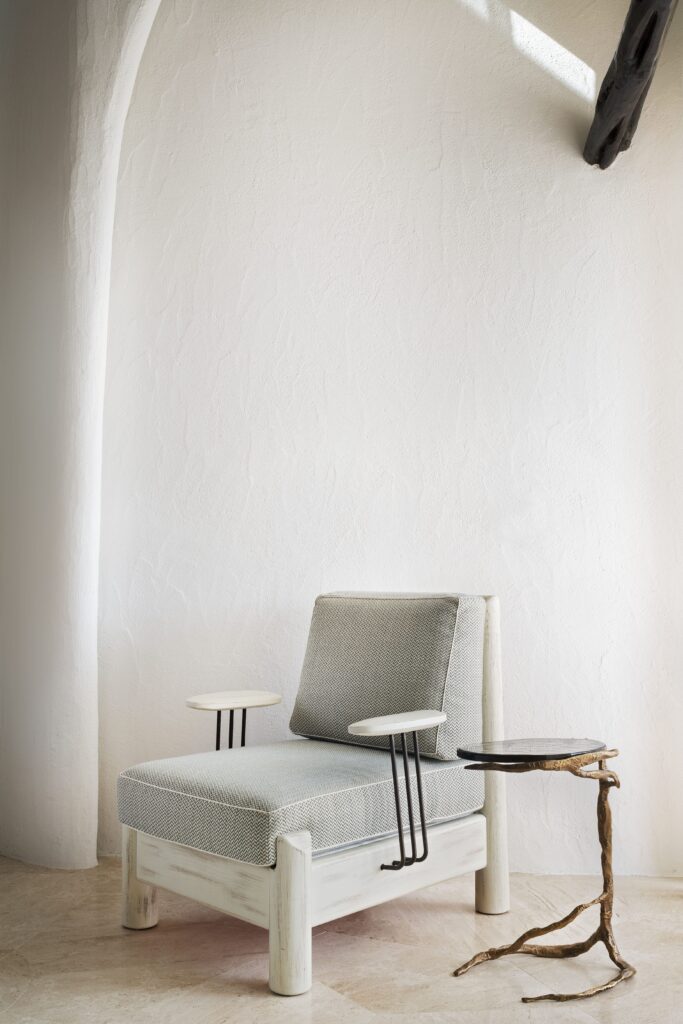b.m. This was perhaps our biggest challenge. Namely, organising the encounter between roughness, even softened, and extreme refinement, in a contemporary vision. In the setting that is Cala di Volpe, the arcades, buttresses, hidden stairs, unexpected benches, and irregular layout of the floors, everything adds structure and makes sense. We wanted furniture that remained free, without artifice, that would be comfortable, warm, and which dialogued with the walls, and combined with the spaces and uneven openings in a timeless and singular synthesis.