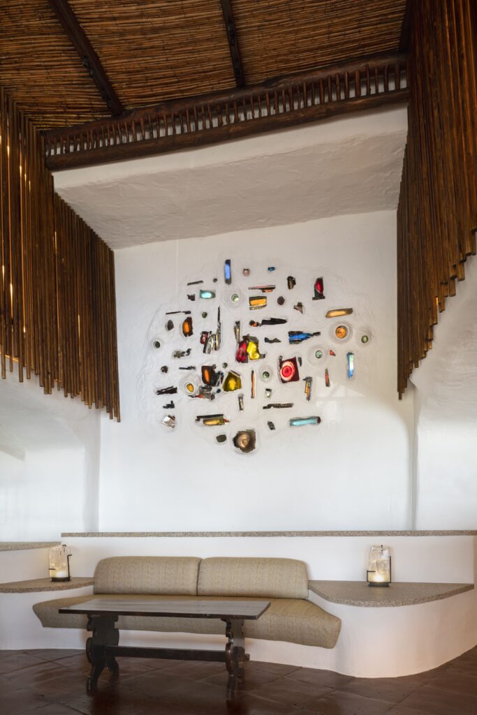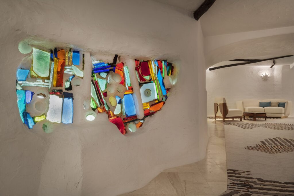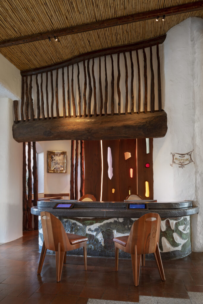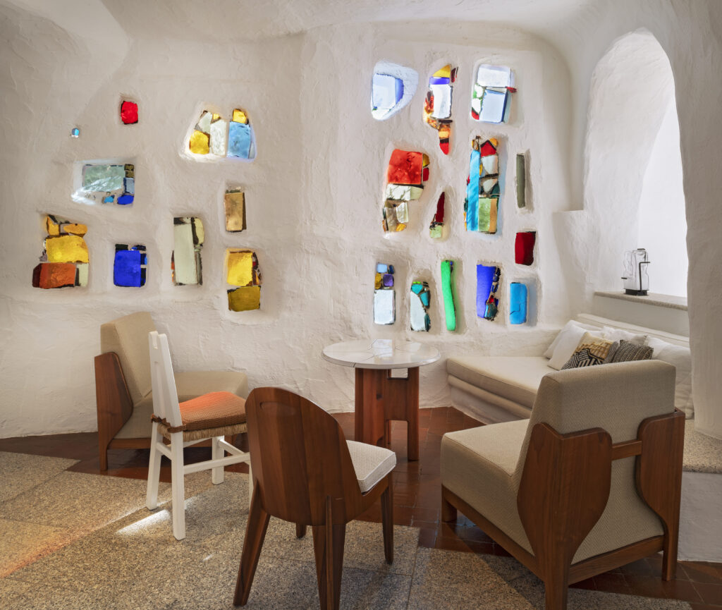 b.m. We have been, as Jacques Couëlle had been in his time, under the control of materials. The Cala di Volpe is powerfully built, inserted into a nature of which it is the extension. Here, it is the material that commands. However, both by reworking what already exists and by bringing in new elements, we were able to give free rein to our inspiration. We played with friendly stone, obedient plaster, rough-hewn yet so noble wood, thick stained glass, and punctured the walls with spiritual, colourful lights.