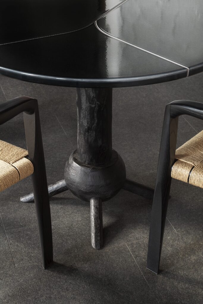 - Armchairs with paddle uprights, chairs with shaped backs, carved from solid walnut and upholstered in leather or cord, coexist with the small original seats present throughout the hotel, which have been given a new lease of life. The tables with bare wood legs associate with enameled lava trays.