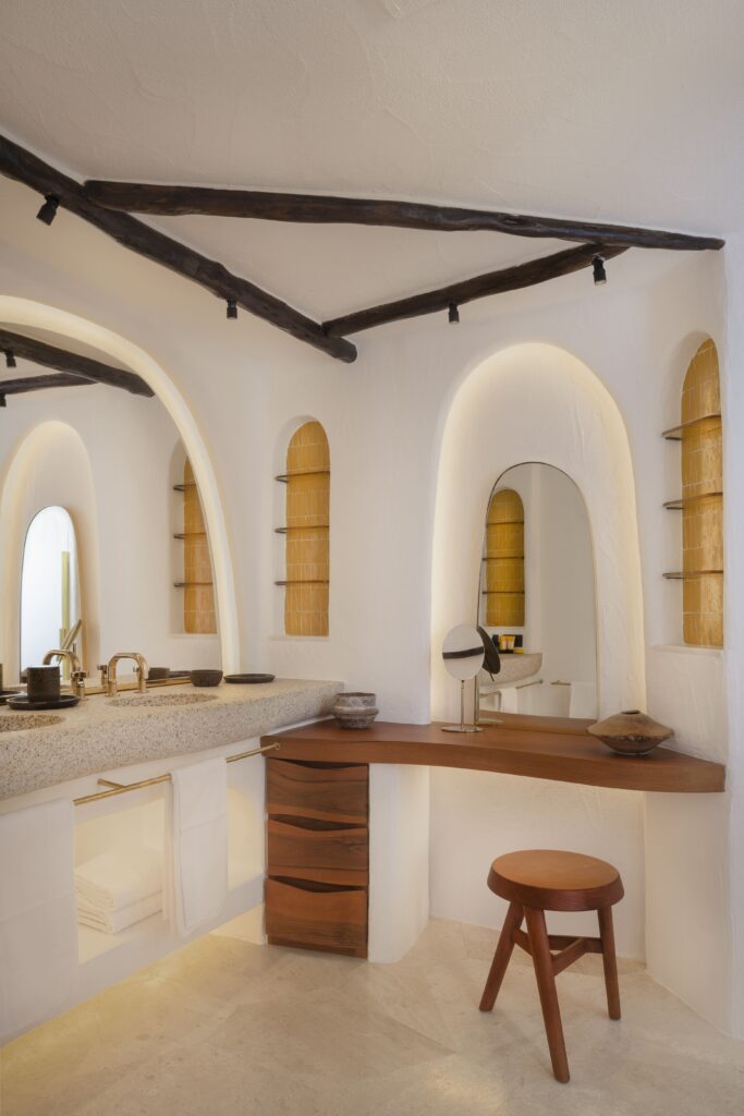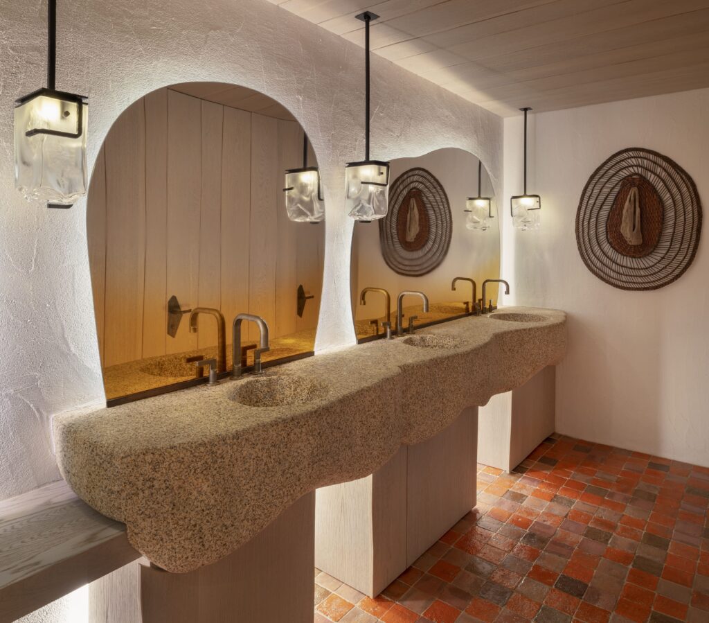 - In the bathrooms, everything is as if polished by water: the (local) granite sinks hollowed or placed, the rounded mirrors reminiscent of the openings, surrounded by studied lighting. The shower and bath areas are covered with brightly coloured zellij tiles. And as a reminder, in some bathrooms, the large stained glass imposes its inspiring presence.