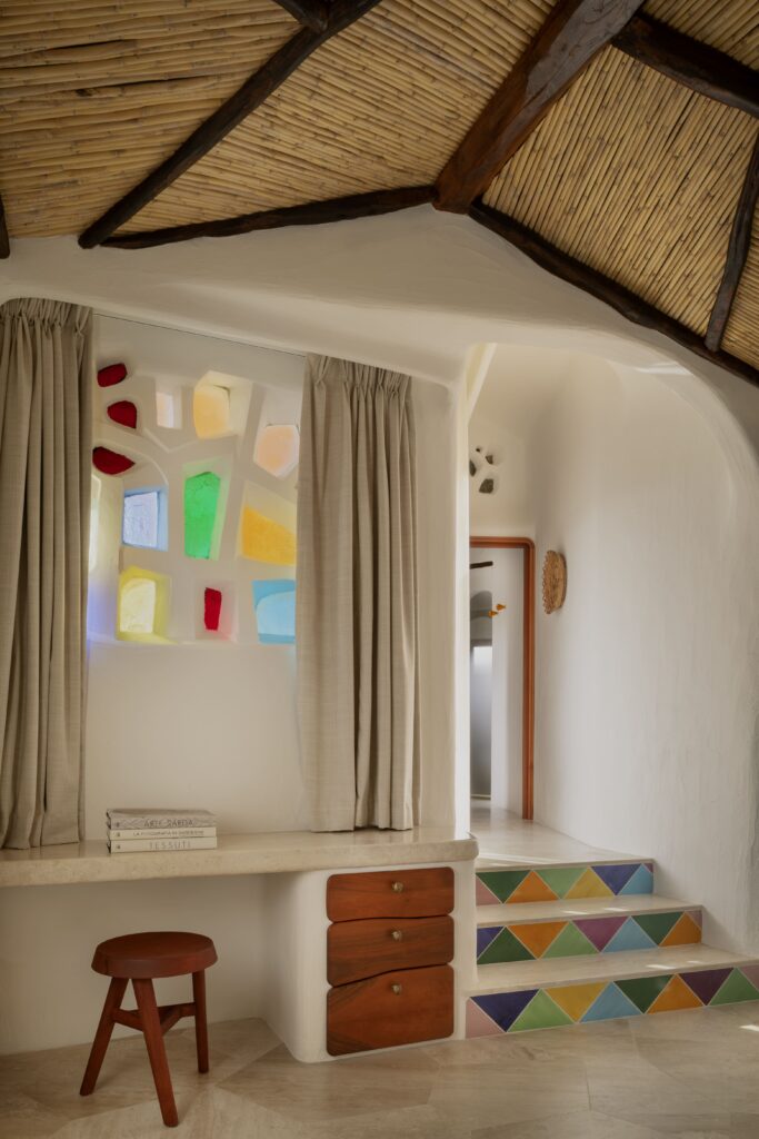 They wanted to keep the soul of the place intact, and loved adapting to the empire of materials reigning supreme here: the powerfully sculpted plaster which reserves havens of freshness, the barely civilsed wood which punctuates the structures and visual effect, the thick glass in colour compositions that filters the unique light of the bay, the warm silky terracotta underfoot, the skilfully reinvented fabrics. The furniture, for the most part, was custom-designed and often mobilised local know-how.