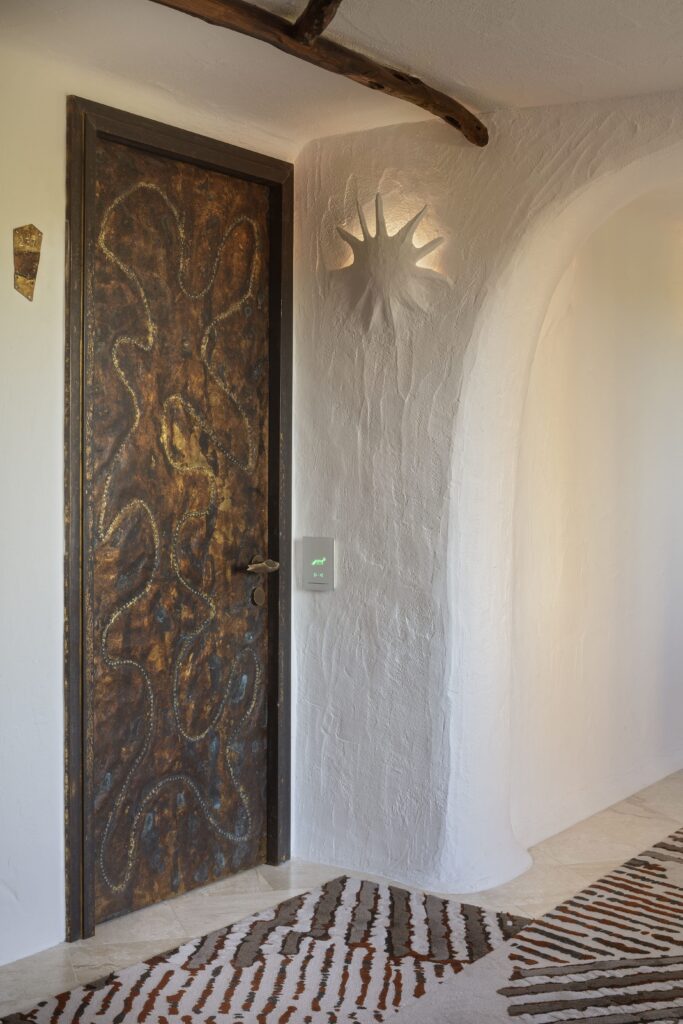 - Specific furniture has been designed: a chest of drawers rounded like a pebble in solid walnut with bronze feet; also in cast bronze, in the shape of seaweed, are these side tables with thick glass tops; fireside chairs and opulent sofas are arranged along the walls or extending from the beds; also console desks in stone, and tables in solid resinous wood. There is discreet wall or lamp lighting everywhere, like this creation superimposing Sardinian pottery.