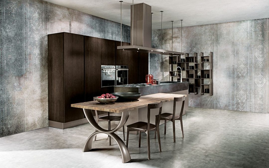 Berloni Kitchens’ B50 model is an extensive programme launched as part of the 50th anniversary celebrations of the founding of the company, and presents a fresh metropolitan look with a vintage flavour. Produced exclusively without handles, it encompasses a comprehensive system of options and finishes that are updated every year, offering many different technical and aesthetic possibilities, colours and wood finishes. The design of the iconic Berloni logo becomes a design motif that defines different elements, such as the leg of the peninsula table. The single surface top with integrated stove and sink of the island, with its suspended extractor, adds a bold central feature. The use of the raw finishes creates a warm yet vibrant space, a modern design that reflects back nostalgically.